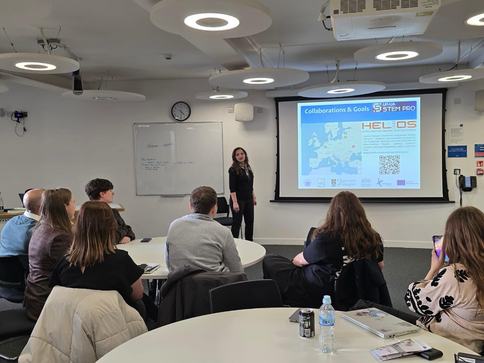 As part of the international programme UK–UA STEM PRO: Professional Development Programme for STEM Teachers and Young Scientists, held in the United Kingdom, Liliia Deva, a contributor to the HELIOS project (“Research and Innovation Strategy for Lviv Polytechnic National University dedicated to White-Emitting Organic Lighting Systems”), delivered a presentation of the HELIOS project to the programme participants.